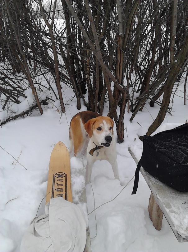вообщем ещё за спиной пара километров.. Решено перекусить пес всегда рядом, даже очень.... постоянно на лыжах) сзади чешит. и мне мешает... снега по брюхо.