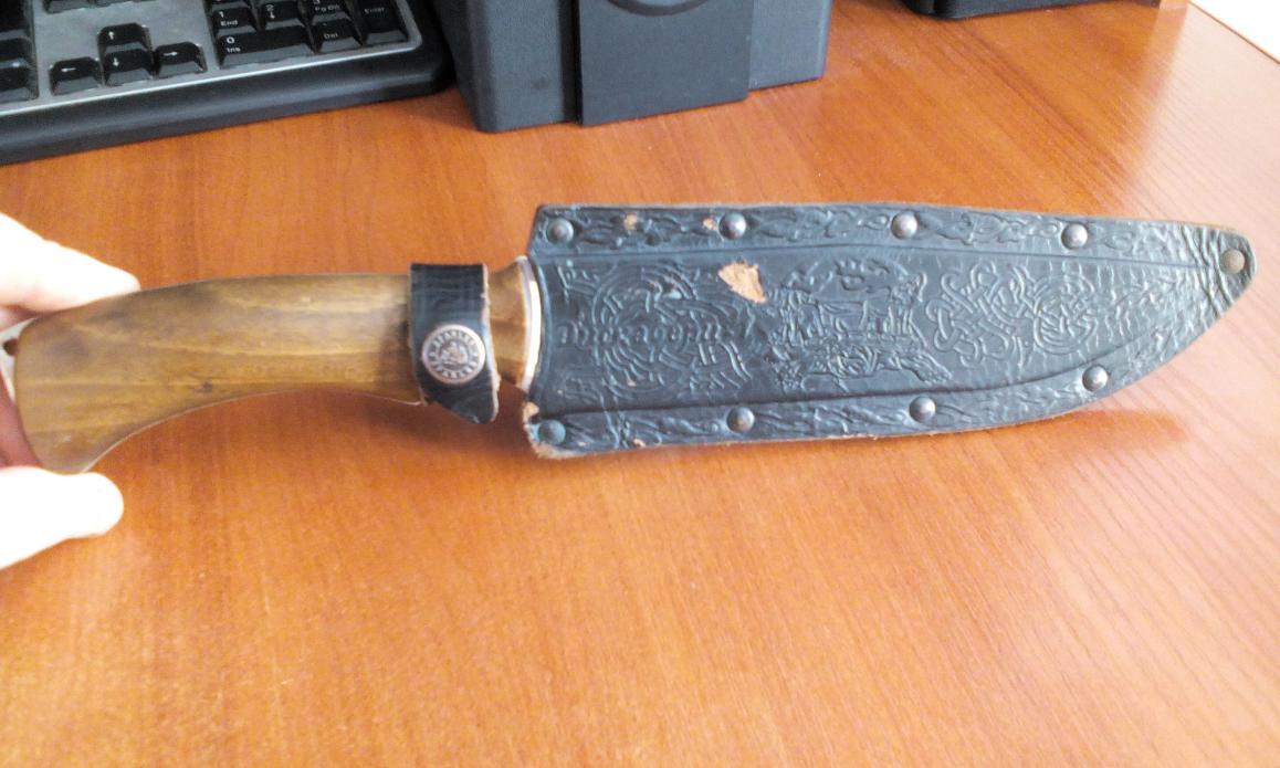 .По ходу дела все было хорошо,но меня не устроил больстр в 3 мм.,сделал второй и спаял их вместе. Потом решил все это припоять на клин,разумеется все поплыло и припой вылез наружу...но думаю это не критично да и более надежно! Нож изначально задумывался без изысков,полировок и т.д.,на фото виден "дятлинг",скорее всего весь больстер будет таким.Ножны заново пропитал,а то как то первоначальный вариант не устроил!!!