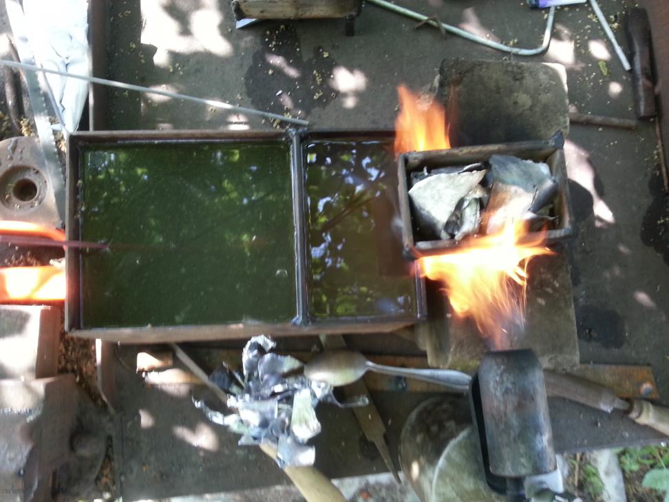Сегодня на даче сварил две дроболейки. Взял два куска швеллера см по 20, к передней и задней части приварил полосу. В одном просверлил отверстие сначала сверлом 6мм, процентов на 80, далее сверлом 0,5мм. В другом швеллере 3 отверстия тоже сначала 6мм а потом 0,7мм. В качестве ската использовал кусок уголка, его наглухо приварил снизу швеллера, чтобы он был той же температуры что и вся дроболейка, ну и зачистил его болгаркой. Расстояние от дырок до ската 0,8 мм, длина первого ската примерно 2,5 см, второго 1,8. Ну и сварил бадью разделенную под вода/масло. Масло использовал трансформаторное.