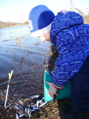 Сын выпускает свой улов.