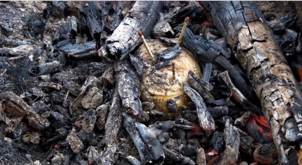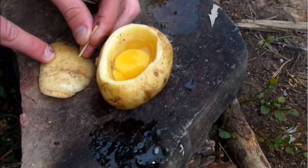 Картофелина и куриное яйцо. Все готовится в полевых условиях, на костре. Точнее на раскаленных углях. Давайте по порядку: