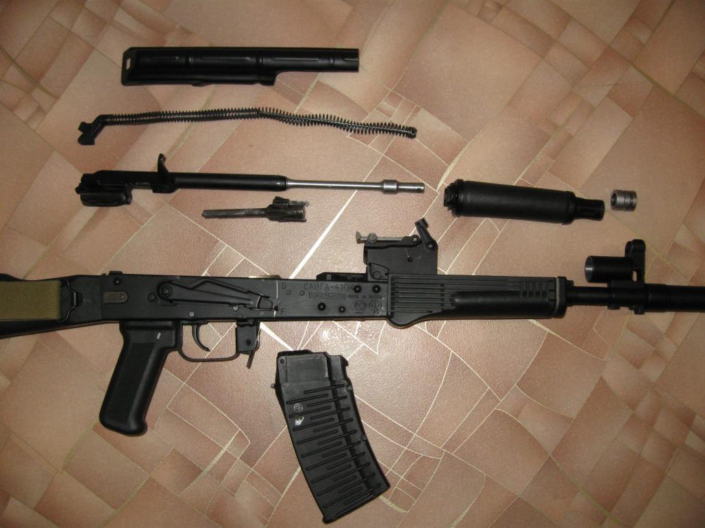 Установлена ребристая крышка от АК-74 с возвратной пружиной, переходник под магазины АК-74, прицельная планка на 1000 м, кастомный ДТК.