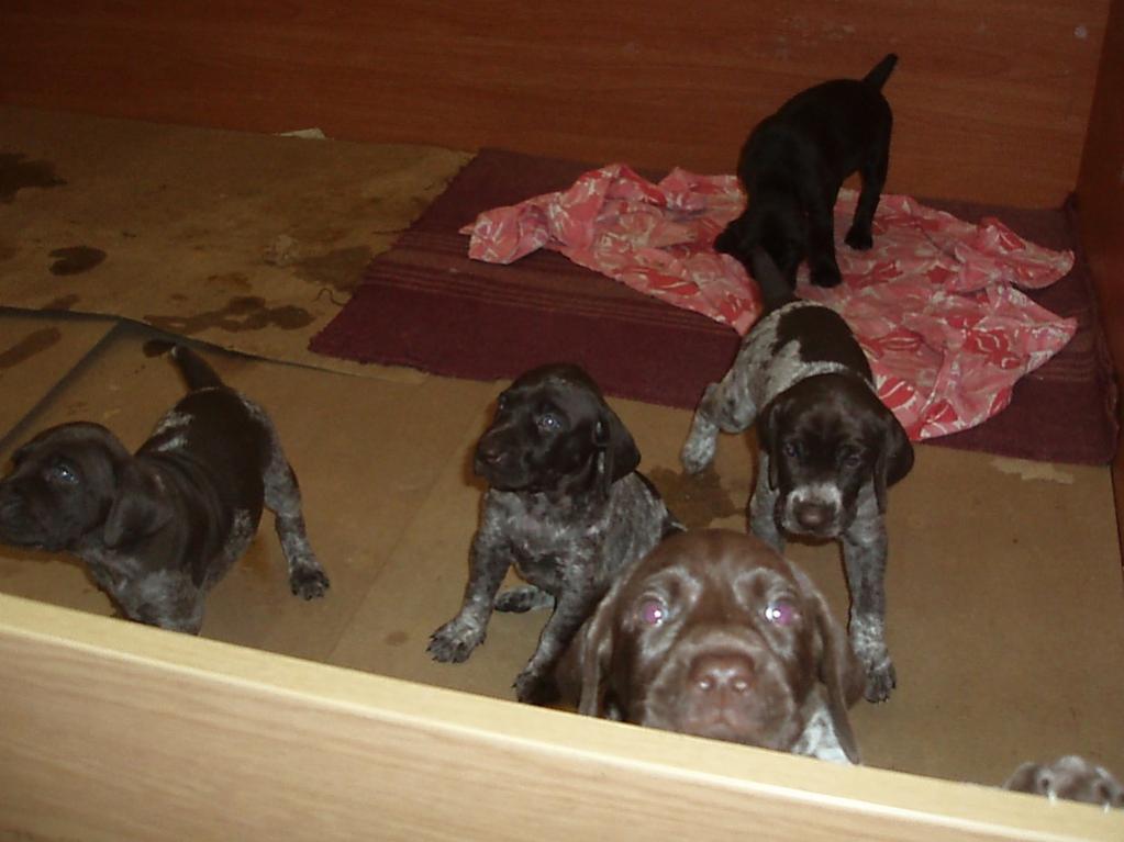 Щенки начали разъезжаться по новым домам, свободны две пегих суки и кобель.