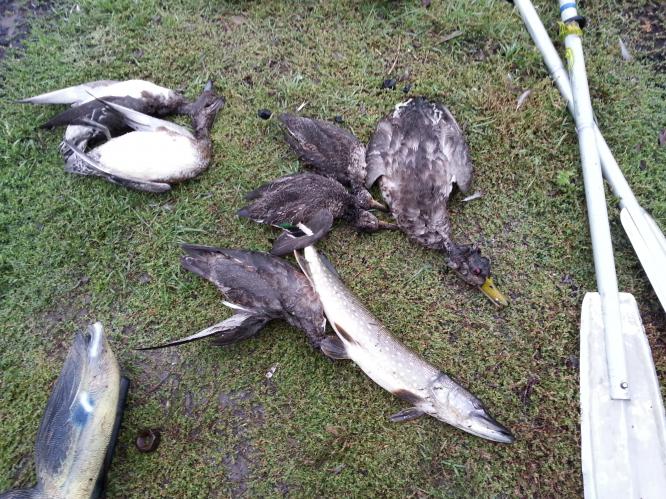 Сегодня с 5 утра шел дождь, не прекращаясь ни на минуту, но утки летали. Взял два чирка, свиязя и крякаша. Проходя по одному болоту увидел щучку на мели, не удержался, выстрелил метров с пяти....не крупная, около 1-1,3 кг, тоже поехала со мной. Ездил с товарищем, он взял два свиязя.