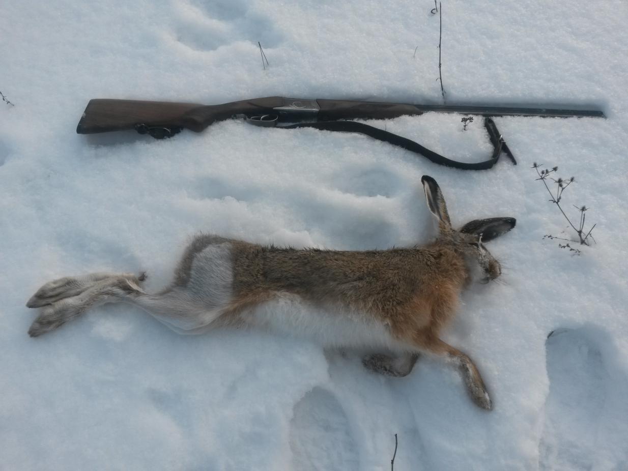 И мы вчера вырвались. Кроме лисьих следов сначала никакие не видели, и тут натыкаемся на зайчий след похоже поднялся от лисы. Прошел полтора поля и лег я пошел, по следу немного прое...л скидку тут товарищ свистит что скидка в траву я поправляюсь захожу в траву и зая не спеша ко мне навстречу взят одним выстрелом с пятнадцати метров. Второй след тоже вместе с лисьим был смешан думали в посадке ляжет, но нет лег в поле поднялся в пяти метрах от товарища и от трех стволов не смог удрать.