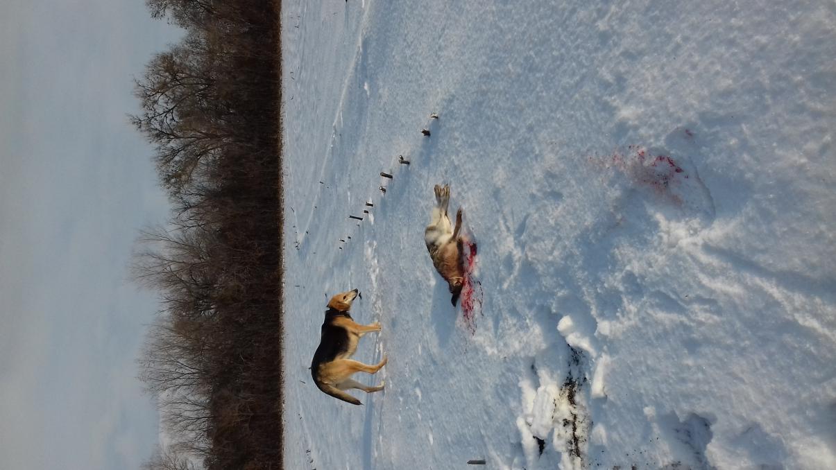 Минут через 20 слышу два выстрела, потом еще два. Потом гон. Смотрю по полю (метров за 700-800 примерно) две точки. Собака дистанцию держит: 20-30 метров и не отстает. Косой то вправо , то влево. В итоге прошел от меня в 15-ти метрах. Был добран.