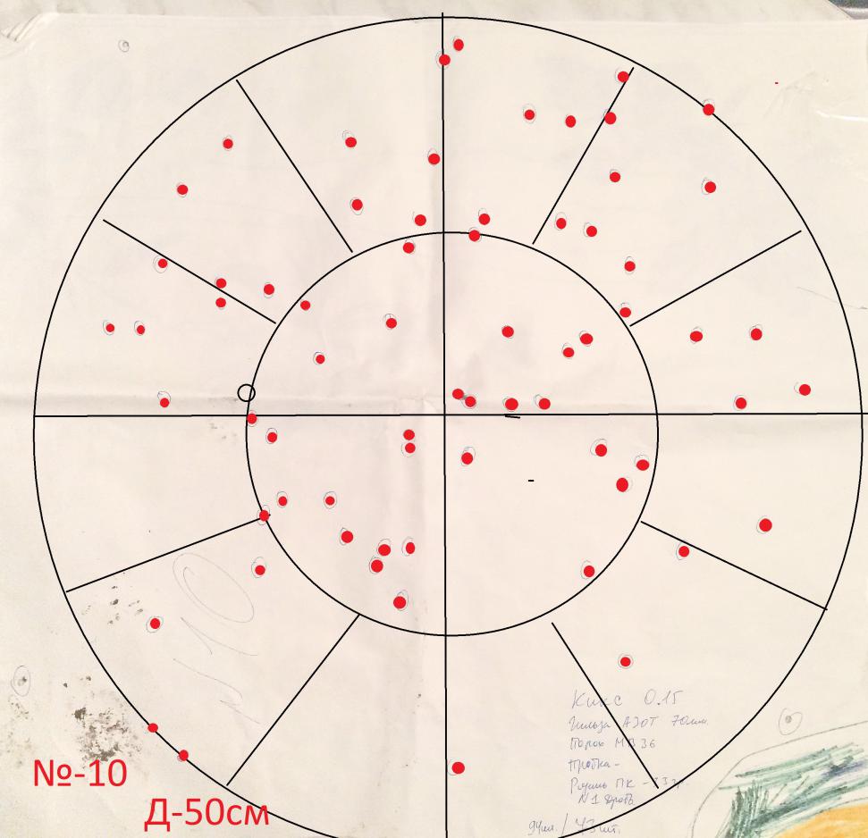 Вот отредактировал мишеньку от Егора (Варяг), результат теста патрона дробь 34г. №2 (109шт.) и собранного на порохе Драго (Нобель). В мишени диам. 750мм, 90шт дробин.