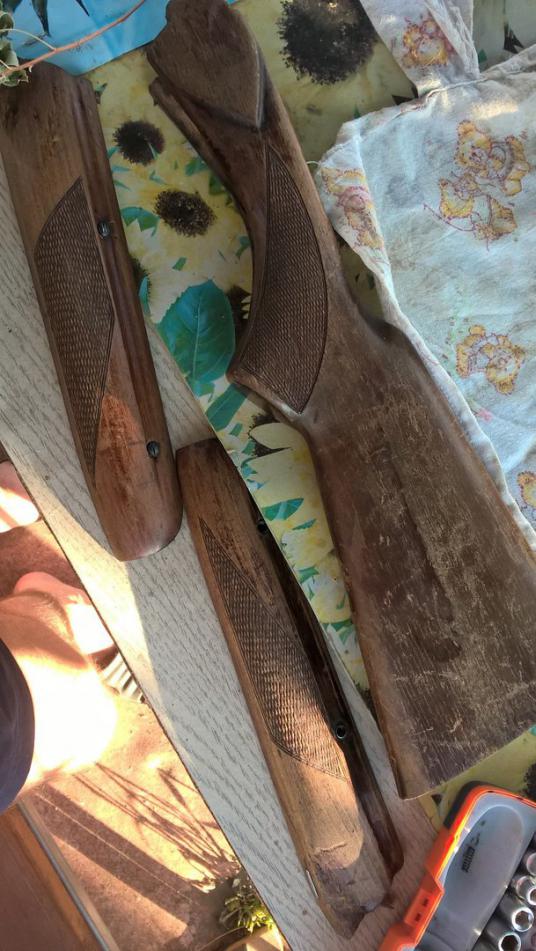 старое лаковое покрытие снял обычным уайт-спиритом (ложе в ветошь-залил жидкостью -в пакет на 20 минут-затем этой же ветошью все снял), потом исправил некоторые косяки использования грубой шкуркой от 60 до 120, после полирую от 240 до 2000(после каждого раза протираю влажной салфеткой , чтобы поднять ворс и так 3-4 раза, пока ворс не перестает подниматься) сейчас остановился на шкурке 600, и результат мне уже нравится). Затонирую водной морилкой"полисандр", пропитывать буду натуральной олифой, привезенной моим дядей из германии с ружейной мастерской(любезно мне отлил немного.
