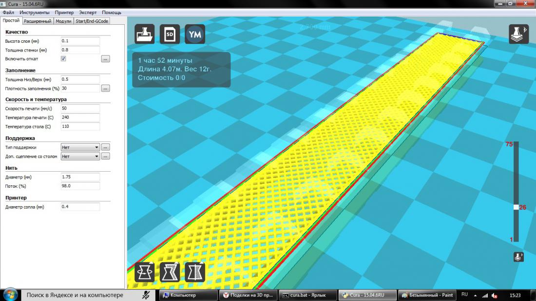 планка печаталась по проге около 2 часов, по факту печаталась часа 2,5 на качестве выше среднего (надо печатать сразу несколько деталей КПД возрастет или одну большую) блок на 220 V, хотя это ниче не дает, х3 сколько тратит киловатт-час, думаю как компьютер.
