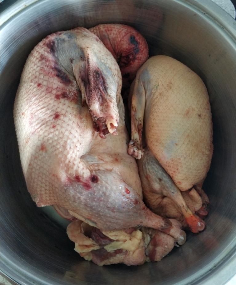 Гусь и селезень фаршированные патрошками, рисом, луком и грибами. Короче сразу пишу - блюдо ОГОНЬ! Реально рекомендую. Рецепт: отмочил в холодной воде слегка подсоленной тушки гуся и селезня (весенний сезон 2018г.) - сутки. Натер их специями (по вкусу) и оставил на пару часов. Патрошки не выкидываю, поэтому нарубил их мелко, обжарил... К ним добавил лука (много) и шампиньонов обжарил. Рис отмочил пару часов смешал со специями: куркума, зира, барбарис (все чуть). Далее набил тушки этой заправкой рис+грибы с патрошками и луком, зашил. В духовку на 2,5 часа на 200 градусах в фольге, еще 30 минут без фольги. Поливал все время жиром. В конце полил пожаренными апельсинами - огонь соус, мой любимый! Вообщем вегетарианцы ели даже)))))!