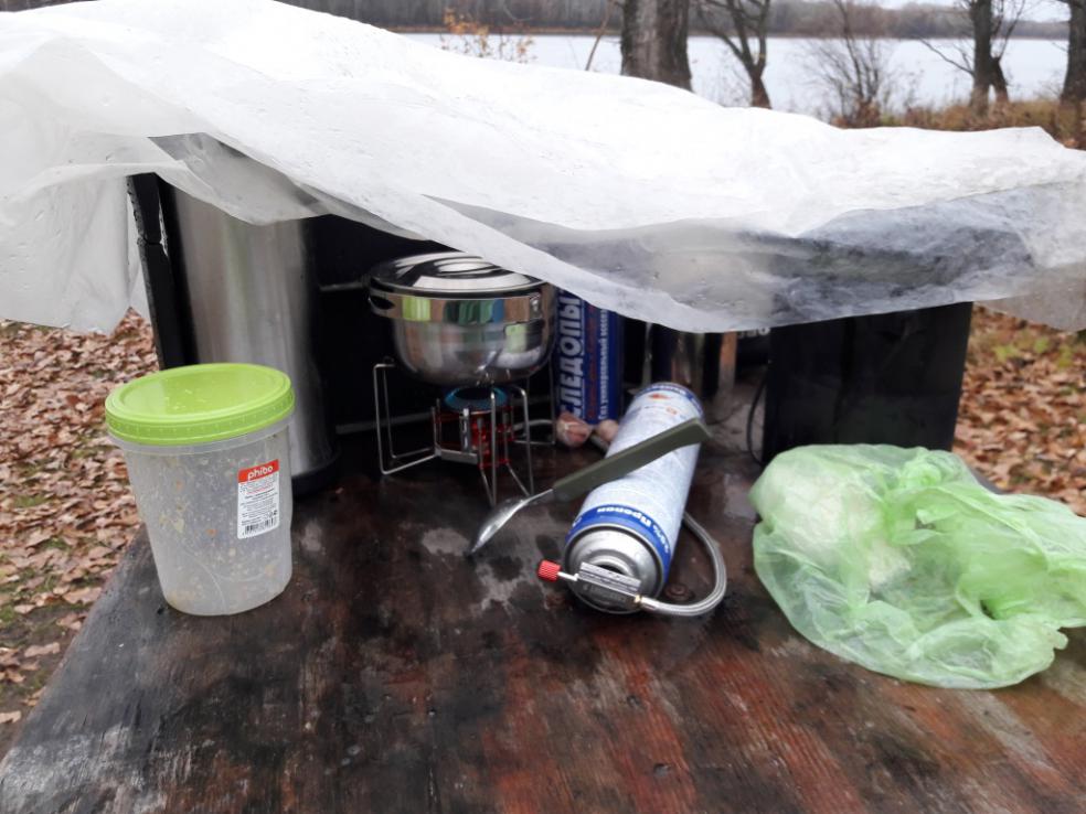 В 11 часов решил отобедать басмой с баранинкой, взятой из дома. Разогревал сидя под пленкой. Но какой кайф вкусить горячего, когда продрог под дождем и ветром. Еще бы писярик для сугреву..... Компенсировал горячим чаем из Горной Шории.