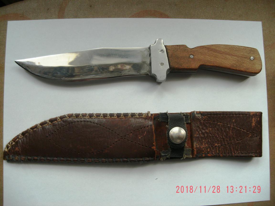 Вот мой верный друг со мной охотится с 1988г. Сталь неизвестна, ручка, по моему, бук, заточку держит отлично, место рождения - одна из зон Кировской обл. Ножны сшиты из старой портупеи в том же 1988-м.