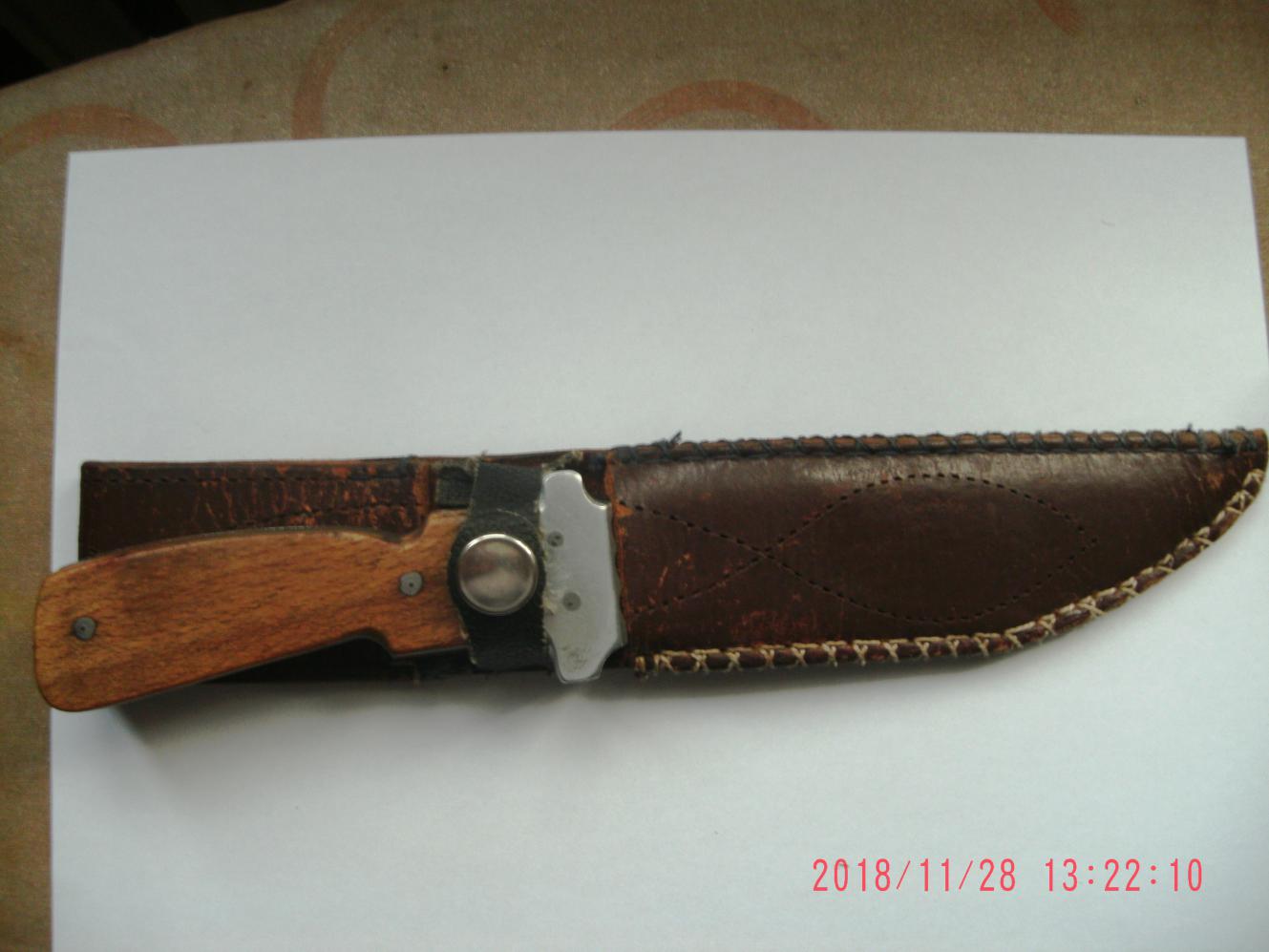 Вот мой верный друг со мной охотится с 1988г. Сталь неизвестна, ручка, по моему, бук, заточку держит отлично, место рождения - одна из зон Кировской обл. Ножны сшиты из старой портупеи в том же 1988-м.