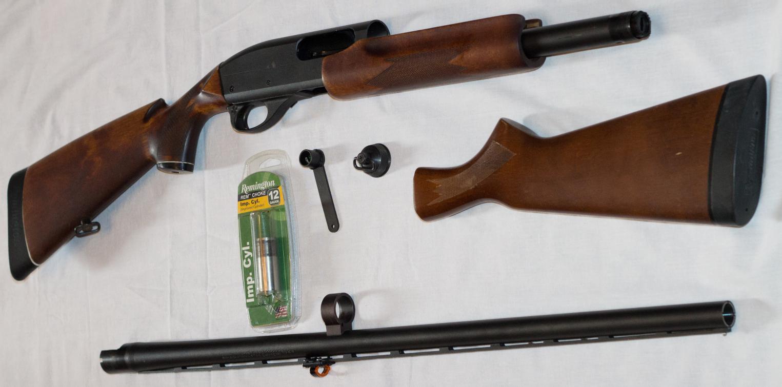 В комплекте: сам Рем с индивидуальным прикладом, родной приклад, 2 дульных сужения, чоковый ключ, светонакопительная мушка (надо приклеить на место), мушка dead ringer