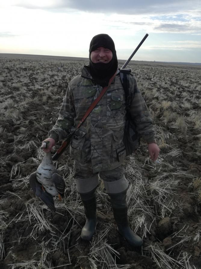 Открылись! Народу в угодьях куча. Некоторые шатались по угодьям и портили охоту. Наши скрадки оккупировали со всех сторон и гусик над нами уже был высоко. И утрянка закончилась без гуся (несколькими селешками на мулян). На вечерней сместились в глубь заливных лугов ещё на 2 км. это 4.5км от машины в один конец. Но и туда добралось пара помощников отрезав левый фланг. Где то 18-00 гусь пошел с разливов на кормёжку. Над нами он шел уже метров 50 - 80 , но мы усердно пытались добыть гусика не жалея патронов. И получилось таки.