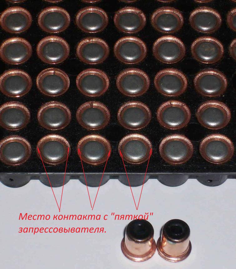 "Пятка", запрессовывающая капсюль, имеет размер под кв209\сх2000 и тд.? Если да, то обратите внимание, на плоскость этой "пятки", которая соприкасается с поверхностью капсюля, в момент запрессовки. Если она ровная, то ее необходимо до работать, за овалить во внутрь, чтобы запрессовка капсюля происходила по краям капсюля, а не по всей плоскости.... Да, а "пятка" то хоть из металла?