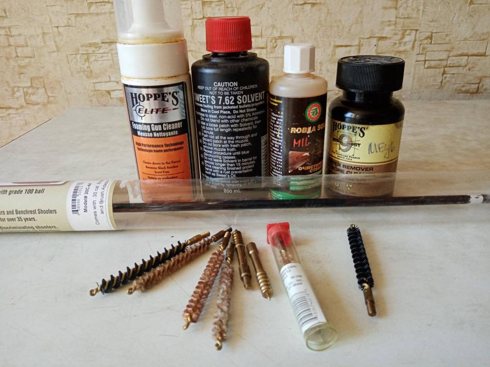 Продам одним лотом: шомпол Dewey 30 калибр (7,62 мм) длина 111см (30С-44), ершики Dewey 30 калибр (7,62мм) нейлоновые и бронзовые, вишеры Dewey латуные 30 калибр, сольвент Sweets 7.62 для снятия омеднения и других загрязнений, пена Hoppes Elite (половина ёмкости) от нагара освинцовки и омеднения, средство для чистки стволов Klever-Ballistol Robla-Solo MIL для снятия меди, томпака, цинка и свинца, растворитель Hoppes Bench Rest - BR904 для снятия омеднения. Цена 5 т.р.