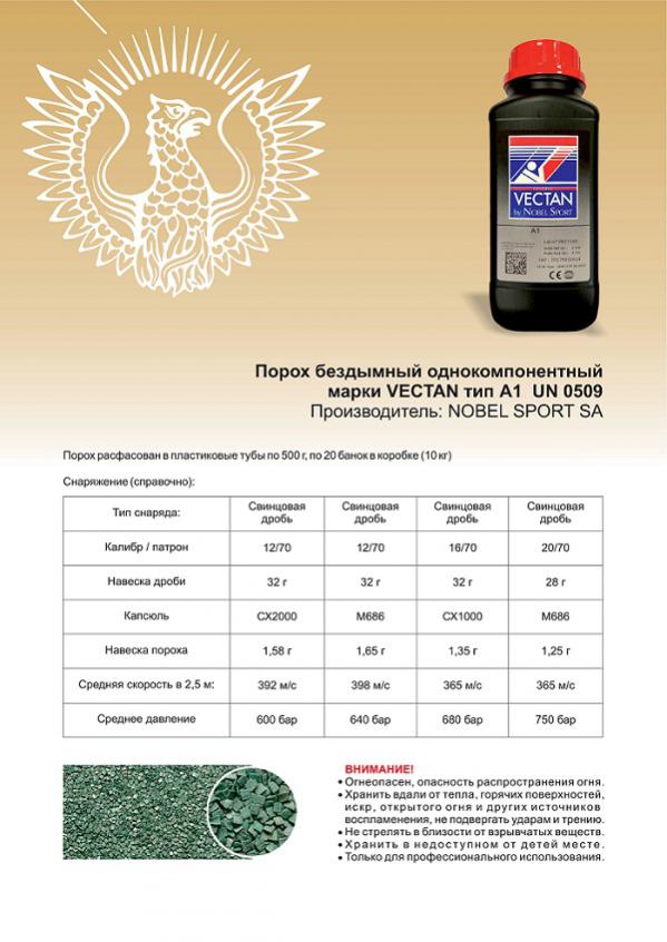 Охотничий одноосновной бездымный порох Drago vectan по заказу компании Cheddite был изготовлен итальянской компанией Nobel Sport и называется Vectan – специально для калибров 12/70, 16 и 20. Он обеспечивает высокие баллистические характеристики и низкое дульное давление. Порох адаптирован к низким температурам, благодаря оптимальной технологии производства. На банке имеется состав и рекомендации по снаряжению.