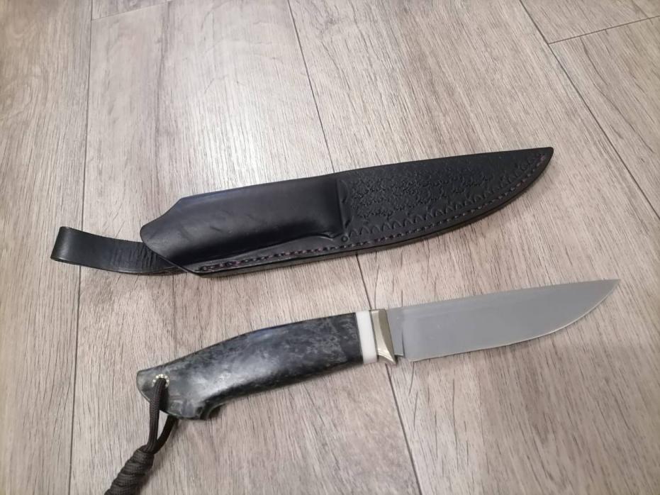 Продам нож универсал эксклюзивного исполнения. Клинок из злючей порошковой кованной нержавейки Behler M390. Рукоять из стабилизированный карелки(фото не передают как на самом деле шикарно она выглядит!) проставка - кориан. Больстер - нейзильбер. Сведение тонкое. Твердость 64 - 65 hrs. Ножны - итальянская растишка. Заточка бритвенная. Цена 20000руб
