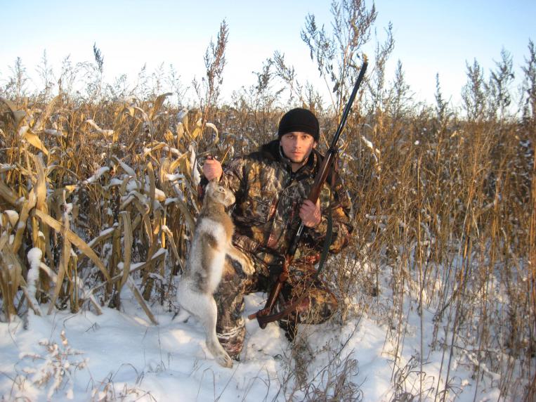 Неудивительно,что первых два промах.Зайчик твой в просвет лесполосы мелькнул на мах скорости и к тебе навстречу рванул.Двумя пристрелялся.третьим взял,классика.По работе тормознули до обеда,но я уже машину сложил и сразу в поле.Снежок свежий мне в помощь.