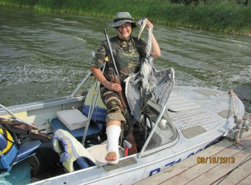 Сегодня планировала уехать на Васильевские в 4 утра, чтобы успеть к зорьке, в итоге благодаря ветру, волне, а главное больной ноге явилась туда в обед. Встали в камыше, крякву видели 3 стайки по 5 голов метров за 500 от нас. Думала даже не выстрелю, но тут налетело это чудо, пришлось открыть сезон.