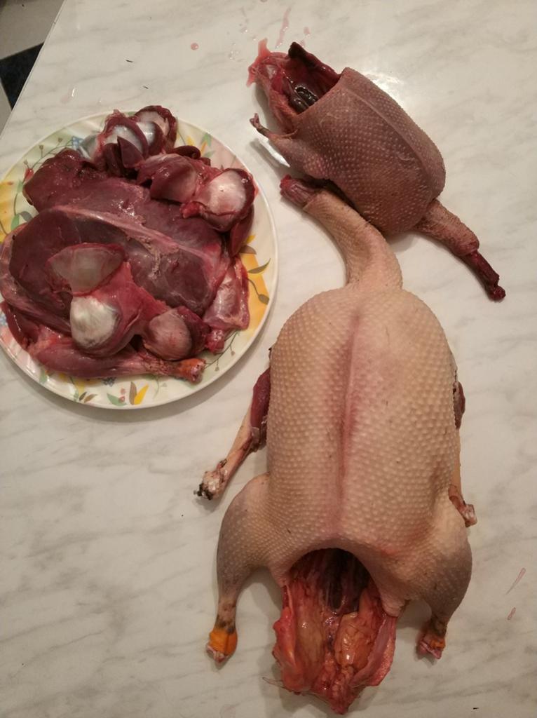 Один из гусей при добыче сильно "пострадал", пришлось снимать и шкуру и разделать его на куски. Попутно с трех гусей и одного селезня добавил потрошки (их отварил предварительно 20 мин.). Далее все это обжарил с луком и уложил в глиняный горшок еще на 1 час в духовку, специи только соль и перец, сухое вино белое. Далее можно добавить к любому гарниру, ум отъешь! Я так ем!)))