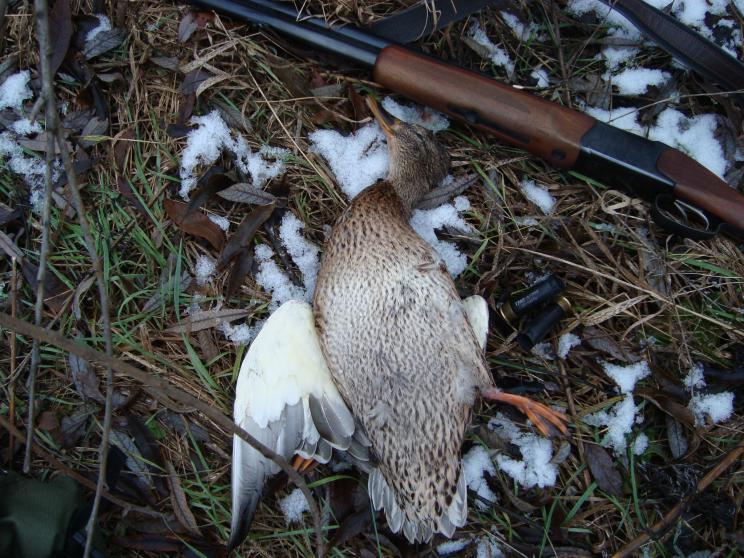 Двигаясь по полям увидел на краю стайку кур, проехав мимо -заметил в зеркало, что не испугались и не убежали,благо метрах в 100 были кусты за которые я и заехал. Зарядившись вышел, подкрался (кусты помогли) выстрел, две лежат. Мельче 3-ки дроби не было с собой. В итоге до воды добрался уже по темному -надежды взять с подхода не оправдались, а в снегопад я не надеялся на вечерний лет. Но, не возвращаться же! Первой налетела одиночка метрах в 40-ка-мажу, от выстрела поднялся еще один крякаш, но далеко-не стрелял. Минут через 30 -летят, штук 10 -стреляю-есть один селезень!! Пока доставал, пока то да се, собираюсь уходить и тут,метрах в 20-ти от меня все это время сидевшая в камышах кряковая решила пойти на взлет-пришлось остановить ее!! Надо же ведь она походу сидела там все 2-ва часа моего прибывания и не дернулась...