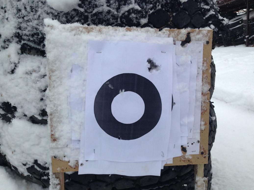В общем получил вот такую картинку: 100 метров, верхние 2 дырки пристрелка, а 5 штук по центру - это уже группа после ввода всех поправок.