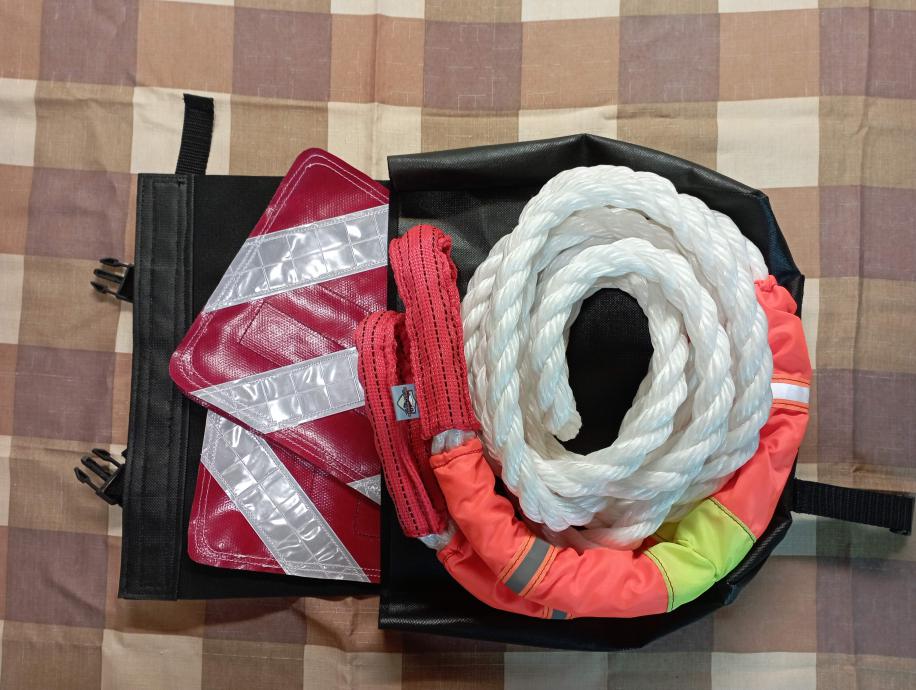 Осталось два комплекта флажков, световозвращающие полосы все как в ПДД для обозначения троса либо габаритного груза в темное время суток. Экспериментальные (ввиду сложности изготовления), полностью из ПВХ что обещает феноменальную живучесть, не восприимчивость к гниению, простоту в эксплуатации и быстроту отмывки от грязи если испачкаются при буксировке. Крепление к буксировочному фалу текстильная застёжка по простому липучка обеспечивает надежное крепление и быстрый демонтаж, при необходимости можно закрепить на автоприцепе при транспортировке лодки, снегохода и т д.
