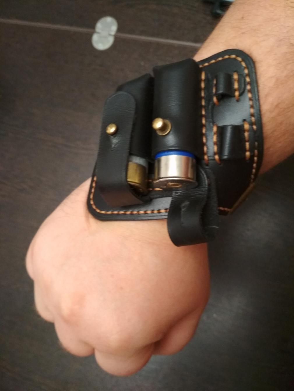 Дабы не создавать отдельную тему, предложу тут патронташ на запястье. Иногда нужен быстрый доступ к пулевому патрону либо просто быстро докинуть пару дробовых в стволы, не шарясь по карманам. 12 калибр. Плюс по бокам можно разместить пару 223 калибра. Заказывали мастеру за 1500. Предлагаю за 1000 руб.