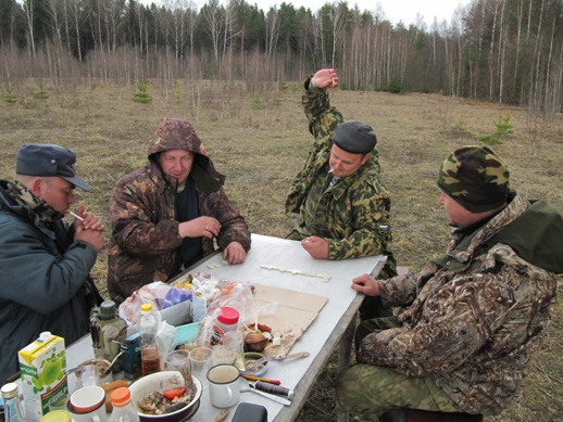 Вечером мы пошли на тягу, на соседнее поле, заросшее молодняком берез. С непривычки я промахнулся по двум вальдшнепам. По приходу в лагерь я увидел Диму, ощипывающего уже второго “вальдемара” и уже издалека подкалывающего нас различными фразами на тему “Горе охотники”. Оказывается, с нами на тягу он не пошел, так как уже разомлел от количества принятого горячительного напитка и наслаждался жизнью, сидя в кресле у костра. Да-да, в его чудо грузовике даже кресла имеются. А кулики тянули аккурат над нашей поляной, чем он и успешно воспользовался. Опыт не пропьешь, как говорится. Вот так вот с шутками, байками, выпив “На кровях!” и закусив шулюмчиком, мы улеглись в прогретом, уютном кунге.