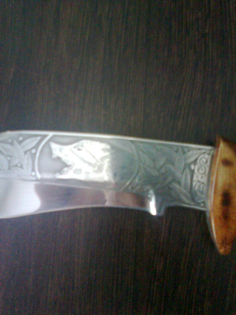 А я вот такой прикупил на выставке. Павловские ножи, дамасская сталь, цена 1 800, по моему очень даже не дорого. Из булатной стали - там же по 2 00 всего. А из нержавеющего дамаска по 5 000 уже (разница с обычным в количестве "узоров", говорит в обычном дамаске 1 200, а в нержавеющем 2 000). Толщина обуха всего 2.2 мм.