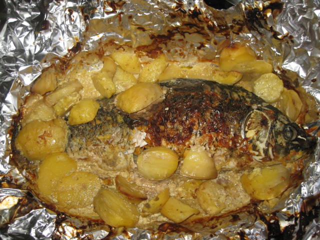 Проснулся рано и пока семейство спит, решил пошаманить на кухне.Сазан в фольге.Размороженного сазана( 2.5 кг примерно )обложил луковыми кольцами,тонко порезанным лимоном и мелко нарезанным чесноком.Оставил помариноваться на часок. В 0.5 густой сметаны добавил приправу для рыбы и смесь перцев с солью.Крупно порезал картошку,убрал лишний лук,положил сазана в толстую фольгу,обложил картошкой и все залил сметаной.Духовку на 200гр и на 1.5 часа .Потом развернул фольгу,включил верхний гриль на 10 мин для золотистой корочки.Пока ходил бриться,обнаружил на столе подарок от жены.Сейчас буду звонить другу-форумчанину и звать на помощь,боюсь,один не осилю.Еще раз всех с праздником и приятного аппетита.