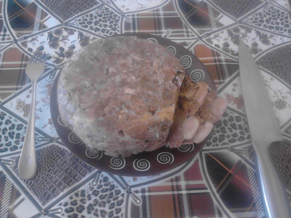 Рецепт: Ощипываем кабанью башку, ну или обдираем (кому как удобно) ![]() , рубим на куски размером с кулак или два(кулаки у всех разные), глаза вырезаю чёт не аппетитные они , моем куски, закладываем в кастрюлю и заливаем водой что б только покрыло мясо (это не холодец, бульон не нужен), варим часа 4-5 (зависит от возраста пятачка) с парой луковиц и морковкой, за час до готовности солим и кладем специи не молотые(семенами, горошками, листьями), вынимаем мясо, даем немного остыть(но не охлаждаем)разбираем на мясо и кости(разбираем аккуратно, а то потом не приятно когда мослы на зубы попадают), в миску с теплым мясом добавляем тертый(давленый)чеснок и черный молотый перец, перемешиваем, Закладываем мясо в чистый(новый) полиэтиленовый пакет, пакет в дуршлаг и снизу зубочисткой прокалываем через дырки дуршлага дырки в пакете, ставим дуршлаг на кастрюлю куда будет стекать лишний жир и бульон, на пакет с мясом кладем тарелку на тарелку 3 литровую банку с водой(груз, гнет), ставим в прохладное место(не в холодильник) на подоконник или к балкону часа на три, а потом в холодильник на часок что б схватилось, и зовём всех к столу или не зовем .