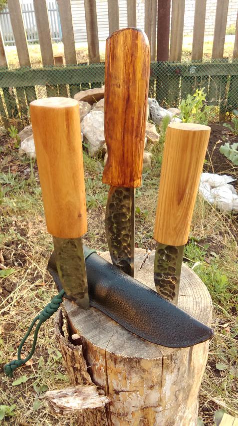Заделал вот таких якутов. Сталь 95Х18. Рукояти дуб. вяз, бук. Есть ещё с орехом. Но оне заняты делом. Клинки ковал не я. Товарищ с Южноуральска поделился. ТО сделана неплохо. Заточку держат. Правятся легко.