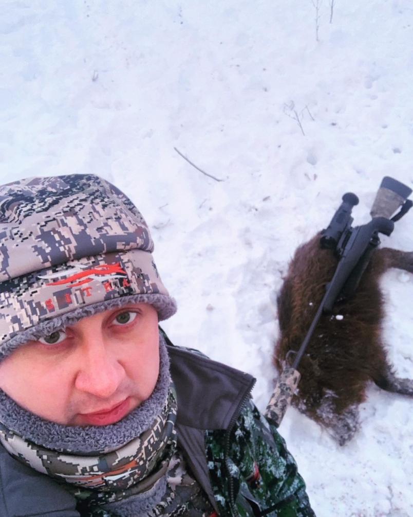 Ребята в соседнюю область пригласили на волка и лисицу... На тропках постояли в овражке… Где то стрельба вдруг, стою , жду… А снега навалило - по пояс проваливаешься… Но эту команду кабанов мы стерегли давно, только из оврага не выходили они днём. А тут и погода и стрельба на той стороне оврага сыграли за нас… кабаны выскочили на тропы и разделившись стали уходить в разные стороны. Смотрю бежит главная мамка, за ней по видимому нянька…. Сеголетков всех волки приговорили… но вдруг третьим выскакивает кабан сначала показавшийся небольшим секачиком… Пуля Л2, вторым Картечь 8,5. Выстрел и над кабаном брызнул фонтан снега - мимо … Второй выстрел - кувырок. Кабан добыт… |