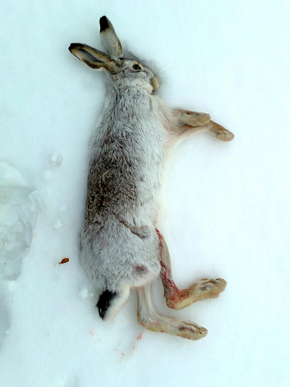 Тоже дело было в среду. Друг со вторника позвонил,спросил-поедем? Я после операции просто. Но сверлит же где то там,и душа воет волком. Короче поехали,уехали в район бинарадского перекрестка,встретили там охотника с гончаком,который взял косого,поболтали,предложиле вместе походить,ну вроде согласился. Переехали на другое место,пошли смотреть следы,мужик с собакой и мы по краям. Взяли след,долго его распутывали,но видно профессор попался,проще говоря запутал он и мужика и собаку. Друг начал заходить с другой стороны,и поднял зайца,стрельнуть не получилось так как,на линии огня был коллега с собакой,короче ушел зая. Друг звонит мне,говорит когда заходил на номер видел скидку,пойди посмотри что да как. Ну я сам раненыйпошел смотреть,нашел скидку и держу путь по напровлению которое держал зай. Прошел метров 60-80 и вот подьем,холп,упал и завезжал. Вижу что перебиты как передние так и задние лапы,но все таки решил добавить для профелактики,а то у меня были случаи что и с перебитыми лапами не плохо зая бегает,а у меня ща не то здоровье что бы бегать за ним. Вот так вот и мне удача повернулась в среду.