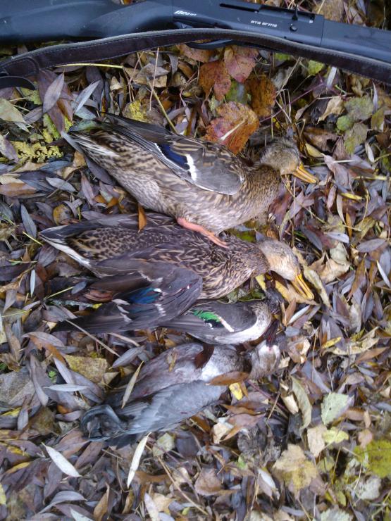 С пятницы до воскресенья вырвались на волю - вольную. В пятницу и субботу погода была тёплая и утя не летала. В воскресенье похолодало и она залетала, а мы проспали утрянку. Пока собирали чучела уронил серенькую. Зато отдохнули.