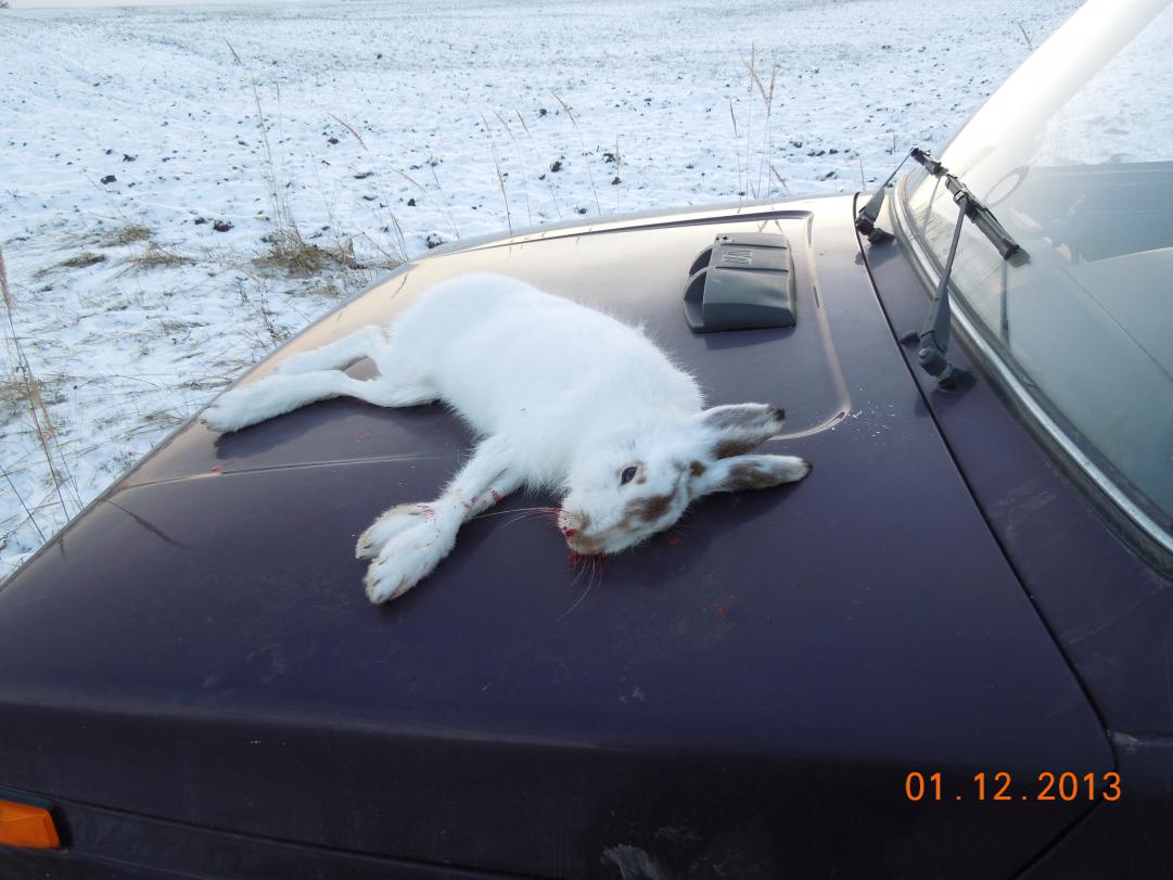 в 7 выехал. пока за собакой, пока до вчерашнего места доехал еще темно было. но следа свежего не обнаружил. сместился дальше и вот он, свежачок. на поле выходил. собаку напустил. минут через 20 кобель завизжал так, что я подумал его там деревенские собаки рвут. ну нет, слышу гон. успел фотик достать. кое как двумя пальцами зажал, на трех цивье примостил. и добыл зайчика. правда после выстрела не сразу нашел, но кобель помог. время было 9 утра. по хорошему можно было ехать домой со спокойной совестью, но решил проверить еще одно место. нашел след русака, пустил собаку. час наблюдал как он на другом конце поля по пашне крутится и в какой то момент я его потерял из виду. прошел еще час. ни собаки, ни гона. выехал на асфальт, проехал. никого. вернулся назад. еще час прождал-тишина. тут уж и мысли не добрые в голову лезть начали. и в какой то момент сквозь ветер стал доноситься лай. только вообще с другой стороны. еще немного подождал и решил все таки вокруг этого поля объехать, выход поискать. объехал, возвращаюсь к тому месту, откуда собаку пустил, мужики на 9-ке стоят. вобщем рассказали они мне как мой кобель коз гонял все это время по другую сторону леса. пока разговаривали, смотрю след собачий на этом перекрестке свежий. тут же начал в ружье дудеть. о, смотрю бежит моя гоночная собака. на этом решил охоту сегодня завершить. зачехлился и домой поехал.