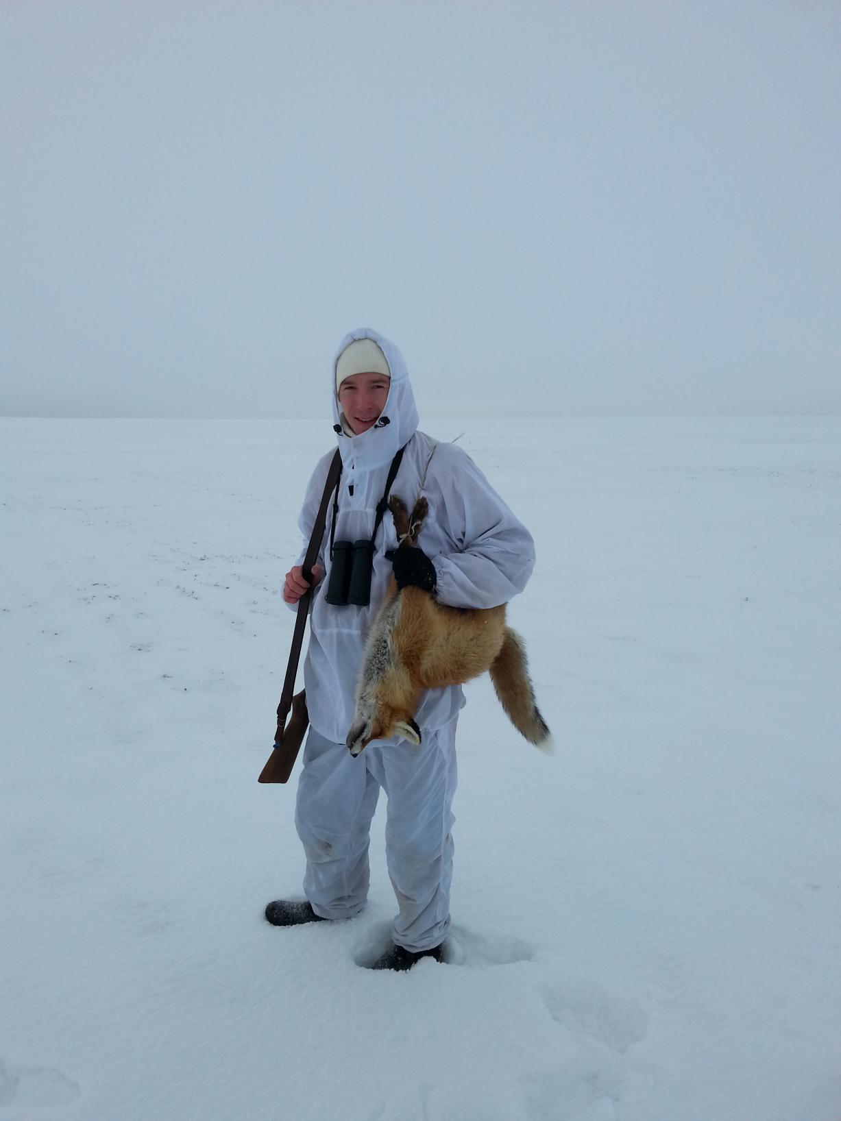 С вечера снежок, а потом ветер((( портил все!!! Но все таки в один из дней случилось чудо, утром тишина, свежий снег... Выехали в 8.30 в угодья, сразу свежак... уход в "запретное" место( Второй след метров через 100 тропки вспрыжка в лесок, только к бугру слышу почесал... подхожу к склону вижу только пятки косого, ставлю своего друга неа след... 15мин. и вот.... Вообщем после был ещё один подъем и тоже уход в запретную зону, как будто знають.... лису к сожалению не получилось погонять((( |