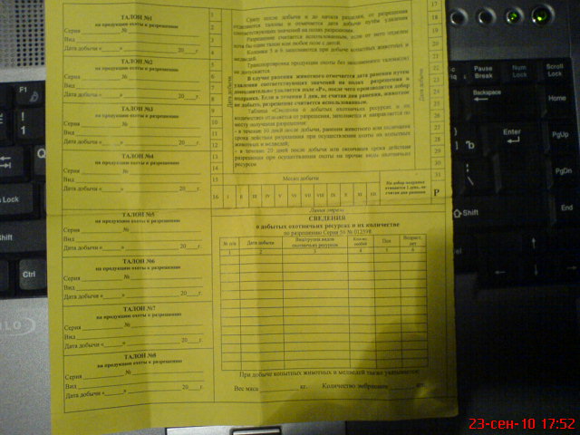 Путевка а к ней разрешение и сзади разрешения восемь талонов и надо отрезать ,заполнить,есть еще календарь там же его надо вырезать,есть еще метка Р,это подранок на его добычу отводиться сутки.