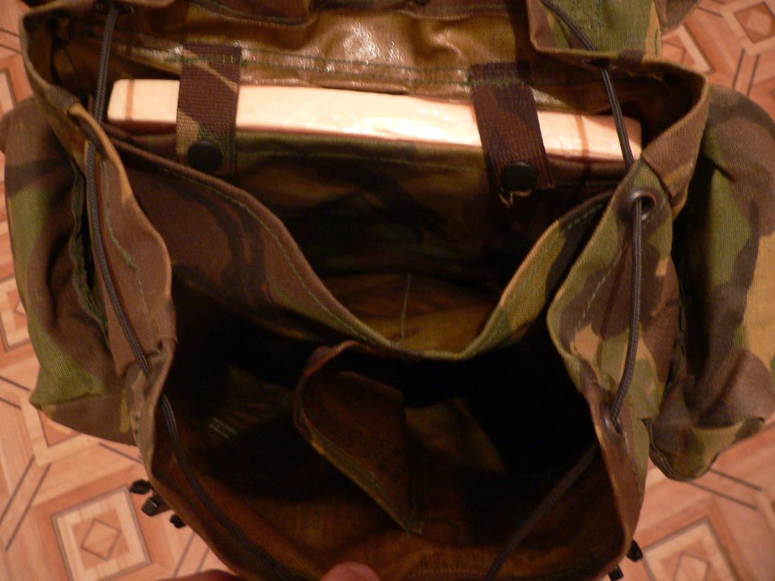 Внесу свои 5 копеек... Имею в пользовании штурмовой рюкзак вооруженных сил Нидерландов на 35 литров с пропиткой, выполненный в расцветке «DPM Camouflage». Внутренняя часть содержит 2 больших отсека и кнопочный карман для документов и бумаг, в который мной вставлена пластина пенопласта для удобства прилегания к спине. Клапан, закрывающий внутренний отсек, крепко прошит, и содержит потайной карман и люверсы для крепления дополнительного снаряжения, а так же позволяет переносить рюкзак за верхнюю ручку. По бокам расположены два вместительных подсумка на клапанах с кнопками. Обратная часть рюкзака имеет регулируемые лямки с мягкими вставками, позволяющие переносить большое количество вещей и снаряжения не сильно обременяя плечи. Верхний клапан и задние лямки содержат быстрые замки для более надёжной фиксации. Ну и мной приторочен вспомогательный инструмент (мачете) для обустройства засидок, сооружения шалашей и прочей работы, который при необходимости открепляется.