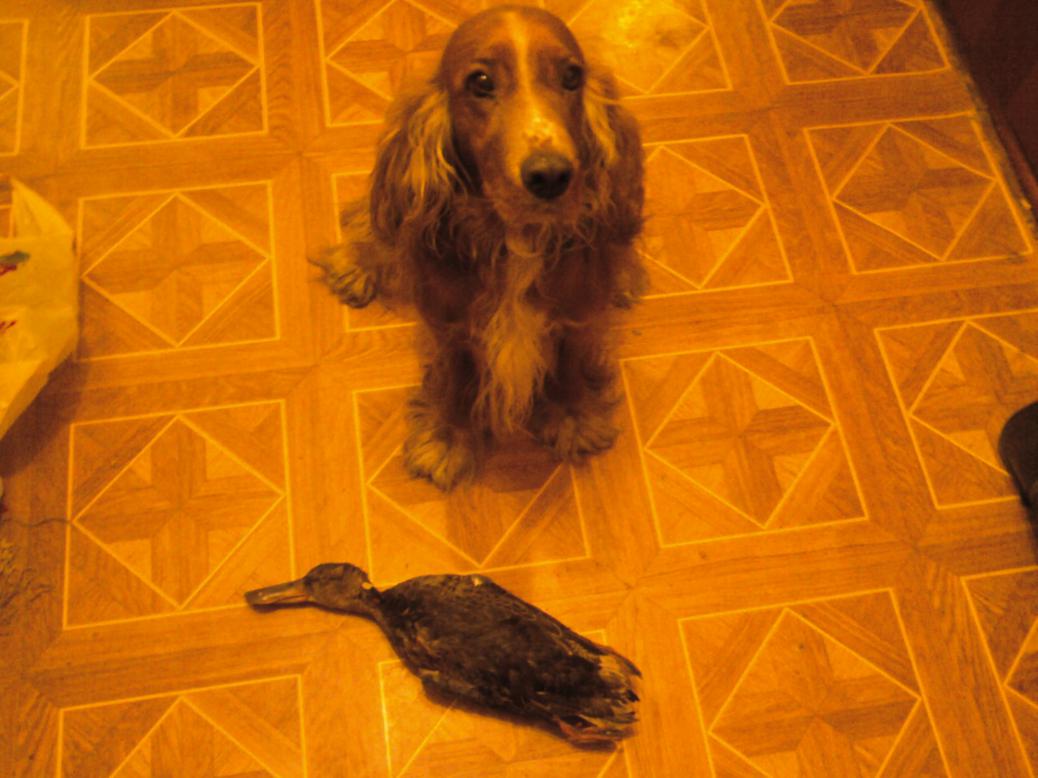 , думаю поймут к кому обращаюсь! После работы решаю, что не могу просто поехать домой, еду в строну Федоровских озер. Время 17.30 Приехав качаю лодку, решаю одевать или нет забродники, решил, что ну их. Дно там все равно илистое, по колено почти, есть шанс, что в забродниках "черпанешь" похлеще, чем без них. Да и времени в обрез. Сажусь на лодку, в чем был, в кроссовках и джинсах и вперед. выплыл за поворотик, смотрю в бинокль, утка какая-та странная, носатая. Прикрываясь камышом подобрался на 70 метров, взял. Широконоска, первая у меня. Упала сразу-же на месте, поплыл вытаскивать, там мелко блин, лодка не идет и все, еле-еле добрался, до нее метра полтора, думаю надо веслом подтянуть. Перегнулся через борт, епть....... вывалился в воду. В чем был, промок до нитки. Но утка того стоила, жирная, аж оранжевая, ну и первая опять-же, интересно! Потом заметил в камышах селезня-крякаша, прямо метрах в 15, стрельнул......блин дистанция маленькая совсем, подранок. Ломанулся от меня на всех парах. Искал-искал бесполезно, прячеться в прибрежных кустах за ветками и уплывает от лодки, стоит подплыть поближе. Потом уж стемнело, так и не добрал. Замерз как собака.Собакин в охоте участия не принимал, снялся для "понтов".
