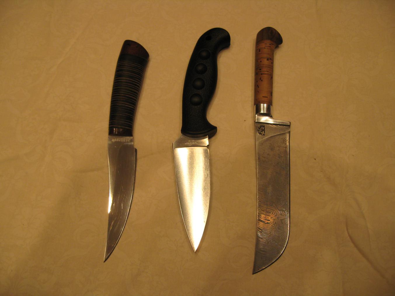 Мои ножи.Кизлярский Скорпион куплен непосредственно на заводе,номерной,в билет записан.На практике крупноват.Для колбаски обычный складной.На охоту всегда беру брусочек марки АЗК36М40.2-3 движения и подправил.