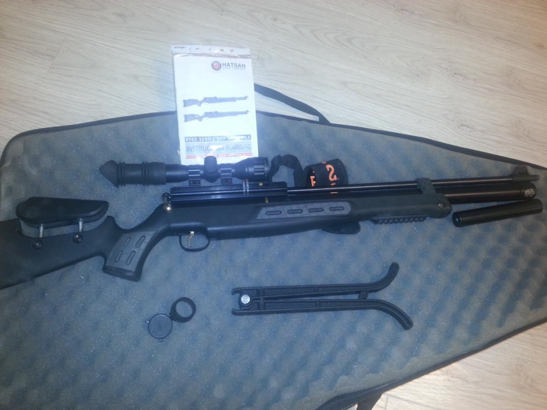 Продам комплект: винтовка Hatsan BT65 RB калибр 4,5 мм, модератор, штуцер для заправки, прицел Leapers 6*32, сошки стоковые, ремень, чехол Holster за 22 000р.