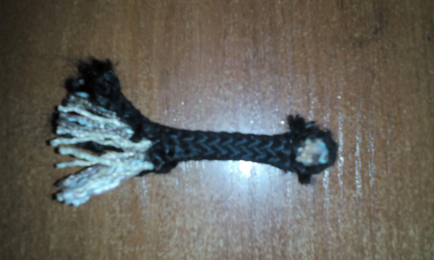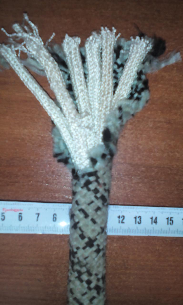 Распускал (вплетал) 70 см. Около 10 пробоев, примерно после 6-7 подрезал 30% (из 18 "ниток" резал 6). Заготовил защитные рукава из джинсов старых, но немного не угадал с жесткостью каната, получились слегка маловаты (петли большие), но некритично.