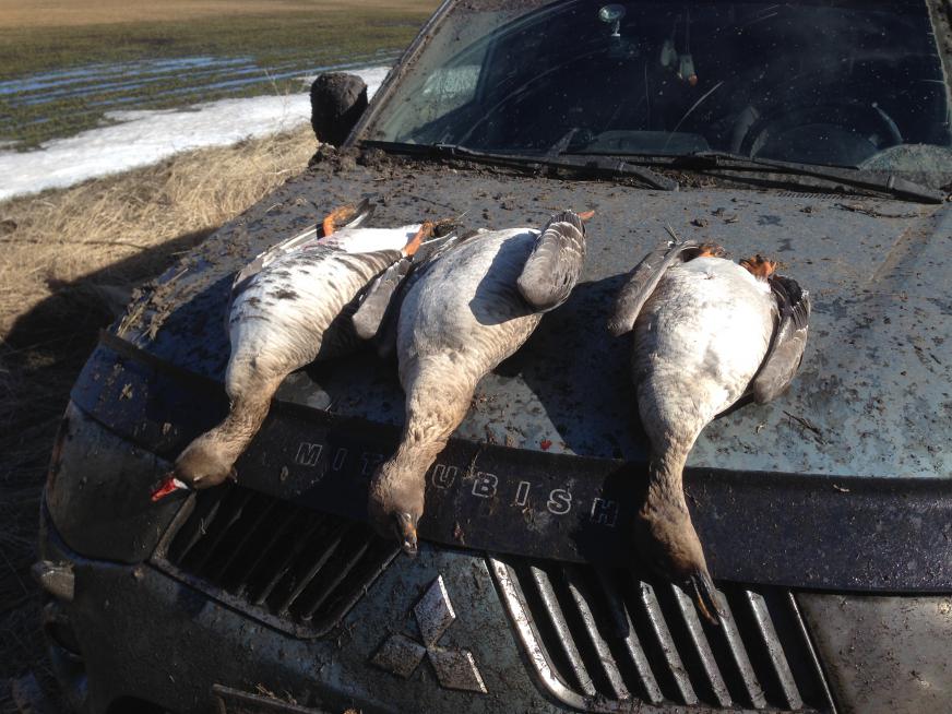 Короче..вечер, точнее в районе 16:00 еще один белолоб и все.... На наше кормовое поле никто из гусеобразных не прилетел. Было очень много стай(целый день) на "кислороде", на манки в ответ га-га, ломка строя и усе, похоже рванул по миграционным путям дальше. Итого за день на троих три гуся. Цвет машины определить невозможно,.... хотя "мокрый чернозем".
