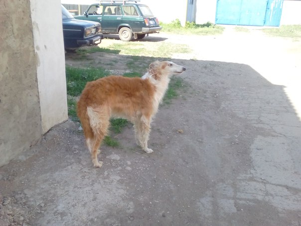 Кинельский район, с. Бобровка. Появился у магазина кобель русской борзой, никто из местных ранее не видел. К людям подходит. Ошейника и клейма нет. Судя по зубам и отметинам на морде парню не менее 3 лет.