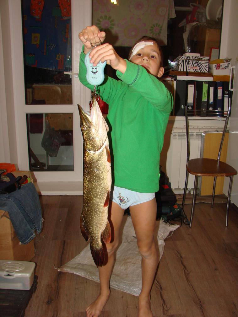 Три-четыре заброса (а перед этим сынище меня тролил: папа - щука, клюЁт), папа-а-а-а-а-а-а-..... Уже и сам вижу! Чуток фрикцион ему отпустил, и ,грю, из воды не подымай. Сын сам к борту подвел, я руками взял. 1кг658грамм!!!