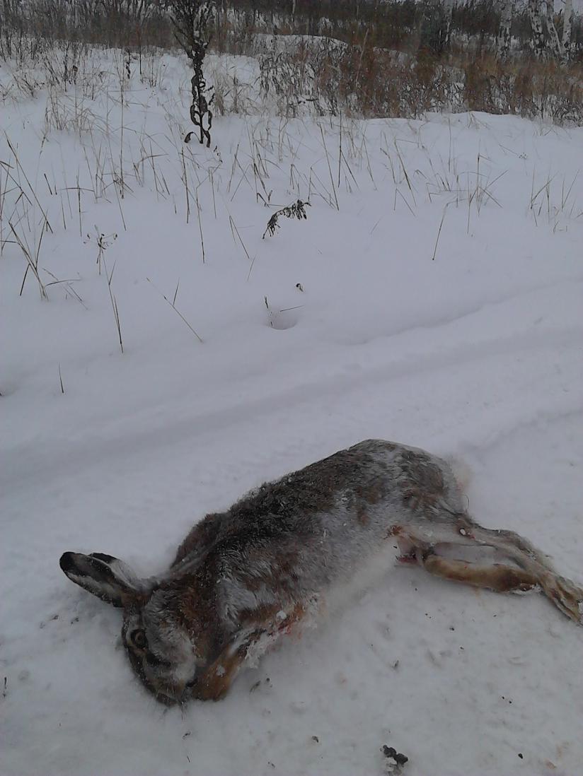 Сегодня между делом сбегал на заю. Снега ночью выпало не мало, короче без собаки поднял 4штук)). Сразу одного выбрал и пошел. 1 круг, второй,на третьем бросил!. Поехал на работу. Час спустя приехал обратно где бросил тропить, встаю прохожу метров 100 и вот он из под кустов, остановился после 3его выстрела! Первые 2ва, через кусты.)